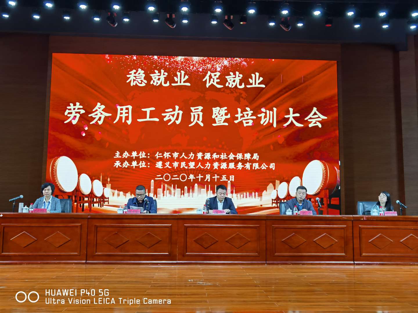 2020年10月15日下午,由仁懷市人力資源和社會(huì)保障局主辦,遵義市民望人力資源服務(wù)有限公司承辦的“穩(wěn)就業(yè) 促就業(yè)”勞務(wù)用工動(dòng)員暨培訓(xùn)大會(huì)在仁懷市茅臺(tái)學(xué)院禮堂舉行。